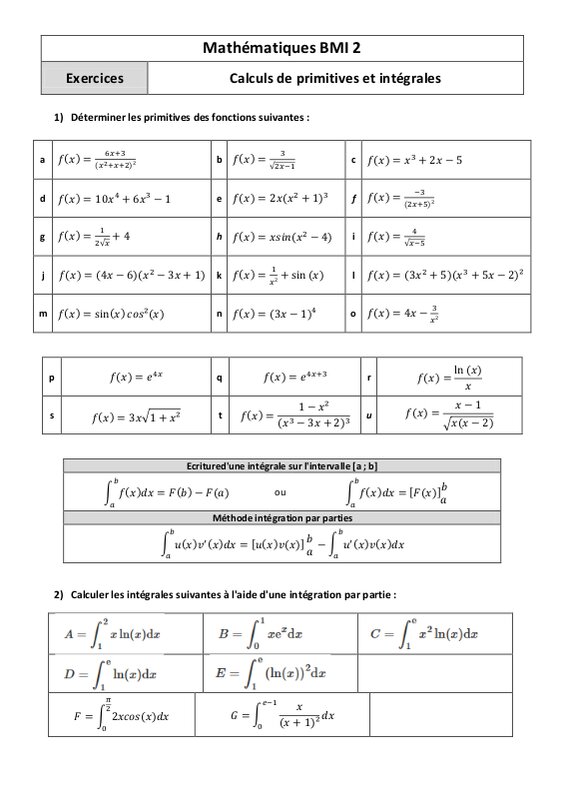 Exercices primitives et intégrales