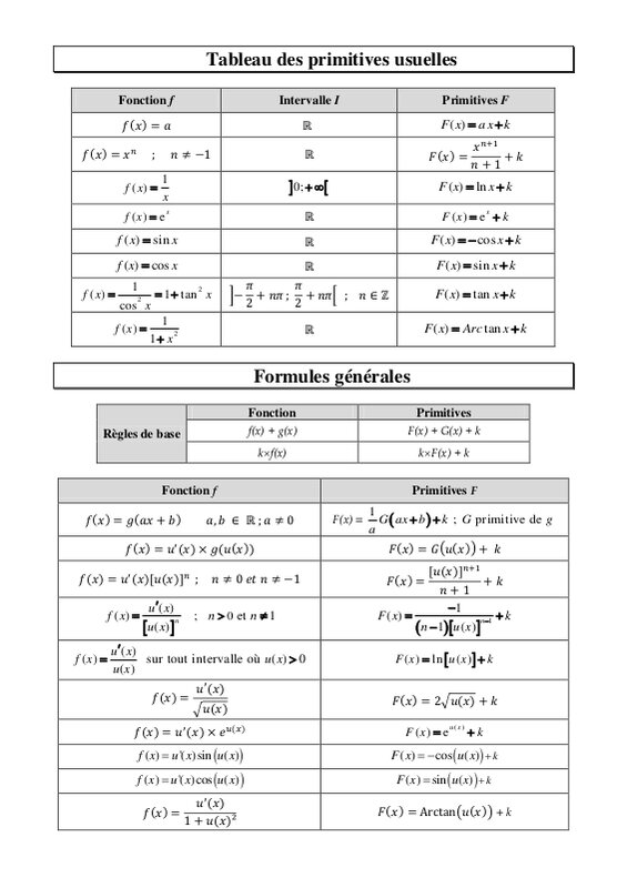 Primitives usuelles et formules générales