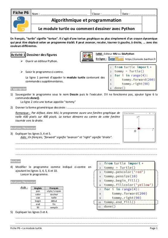 Fiche P6 - Le module turtle ou comment dessiner avec Python