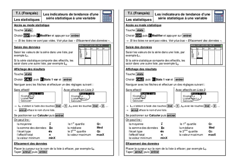 Fiche Calculatrice T.I. (Francais) - Statistiques : Les indicateurs